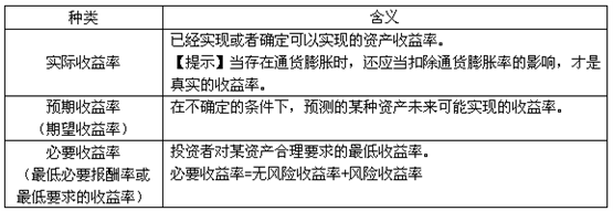 【解析】必要收益率也稱最低必要報(bào)酬率或最低要求的收益率,表示投資者對(duì)某資產(chǎn)合理要求的最低收益率, 必要收益率等于無風(fēng)險(xiǎn)收益率加風(fēng)險(xiǎn)收益率。實(shí)際收益率是指已經(jīng)實(shí)現(xiàn)或確定可以實(shí)現(xiàn)的資產(chǎn)收益率。預(yù)期收益率是指在不確定條件下,預(yù)測的某種資產(chǎn)未來可能實(shí)現(xiàn)的收益率。