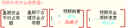資金需要量=(基期資金平均占用額-不合理資金占用額)×(1±預(yù)測(cè)期銷售增減率)×(1-預(yù)測(cè)期資金周轉(zhuǎn)速度增長(zhǎng)率) |