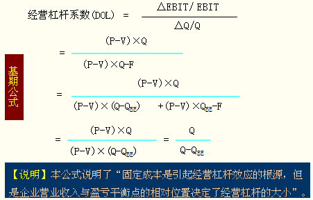 固定成本是引起經(jīng)營(yíng)杠桿效應(yīng)的根源,但是企業(yè)營(yíng)業(yè)收入與盈虧平衡點(diǎn)的相對(duì)位置決定了經(jīng)營(yíng)杠桿的大。ê竺嫖覍⒔o出一個(gè)由保本點(diǎn)推算出的經(jīng)營(yíng)杠桿系數(shù)公式),即經(jīng)營(yíng)杠桿的大小是由固定性經(jīng)營(yíng)成本和息稅前利潤(rùn)共同決定的。