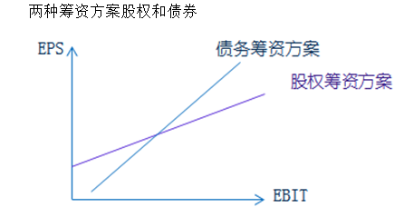 假設(shè)有兩種方案,債務(wù)籌資和股權(quán)籌資。圖示中橫軸表示的是息稅前利潤(EBIT),縱軸表示的是每股收益(EPS)。