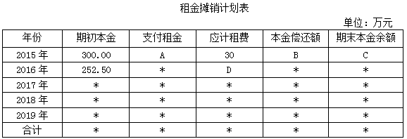 某公司于2015年1月1日從租賃公司租入一臺(tái)大型設(shè)備,該設(shè)備市場(chǎng)價(jià)格280萬(wàn)元,運(yùn)輸及安裝調(diào)試費(fèi)20萬(wàn)元(由租賃公司承擔(dān)),租期5年,租賃期滿時(shí)預(yù)計(jì)殘值10萬(wàn)元,歸租賃公司所有。年利率為8%,租賃手續(xù)費(fèi)率為2%。租金于每年末等額支付。