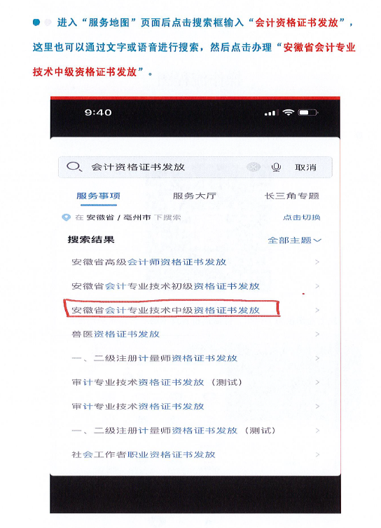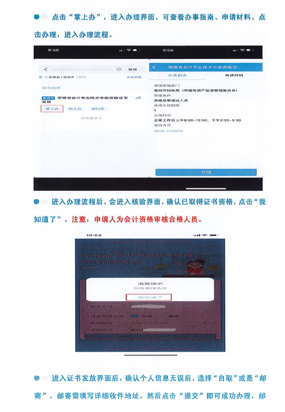 1.線上郵寄發(fā)證。2022年3月8日至4月8日,資格審核合格人員可登錄皖事通APP,通過消息欄點擊證書發(fā)放信息,進入證書發(fā)放系統(tǒng),填寫郵遞地址、聯(lián)系方式等信息,EMS可免費郵遞送達。同時,也可通過長三角政務(wù)地圖搜索“安徽省會計專業(yè)技術(shù)中級資格證書發(fā)放”,選擇“毫州市”,點擊掌上辦申請證書發(fā)放。(附件:操作流程圖)