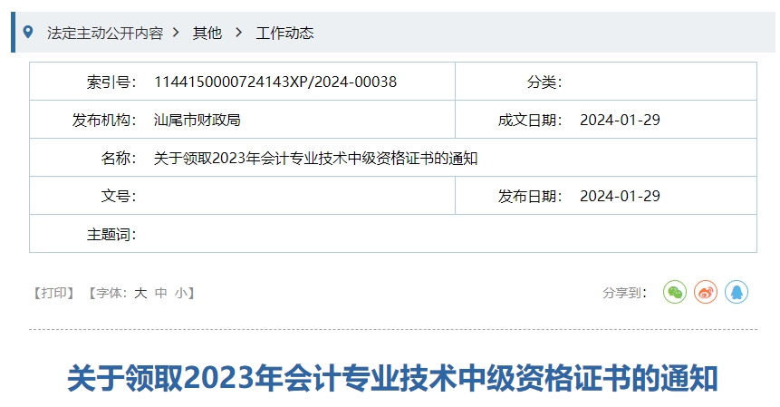 關(guān)于領(lǐng)取2023年會計專業(yè)技術(shù)中級資格證書的通知發(fā)布
