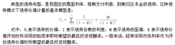 典型的債券類型,是有固定的票面利率、每期支付利息、到期歸還本金的債券,這種債券模式下債券價值計量的基本模型是: