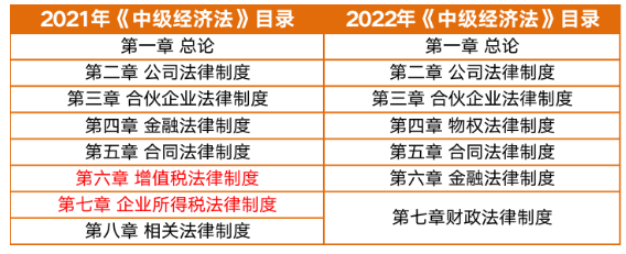 2022年《中級經(jīng)濟(jì)法》教材由原來的8章,調(diào)整成為了目前的7章。重要的變動,也是引發(fā)行業(yè)猜測的調(diào)整,就是刪除了“增值稅”“企業(yè)所得稅”這兩個(gè)側(cè)重于“稅”的相關(guān)章節(jié)。相應(yīng)地增加了更貼近于“經(jīng)濟(jì)法”概念和程序的內(nèi)容,比如新增了“物權(quán)”“信托”“行政復(fù)議”“行政訴訟”等法律制度。