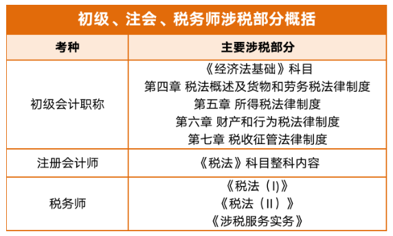 比如初級會計(jì)職稱《經(jīng)濟(jì)法基礎(chǔ)》中第四章至第七章涉及十余種稅法的基礎(chǔ)知識,注冊會計(jì)師擁有單獨(dú)的《稅法》科目,稅務(wù)師更是有“三稅”考種重頭戲。所以不可能唯獨(dú)中級會計(jì)職稱一直沒有稅務(wù)相關(guān)內(nèi)容,形成“知識斷檔”。由此可以推測,“稅法”部分很可能在今后,會以全新的形式出現(xiàn)在中級會計(jì)職稱的考試中。也就是大家一直認(rèn)為的,中級會計(jì)職稱考試中會單獨(dú)設(shè)立《稅法》科目,讓中級考試,由三科變成四科。