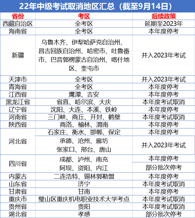 2022年的疫情此消彼長,初級會計職稱考試和注冊會計師考試已經(jīng)受疫情影響,個別地區(qū)不得不延期舉行,但在剛剛結(jié)束的中級會計考試中,個別地區(qū)則直接宣布取消2022年考試,并入到2023年考試。“取消”二字對所有2021/2022年備考中級考試的考生無疑是晴天霹靂。截至9月14日,全國受疫情影響而取消的考區(qū)已超過40個。