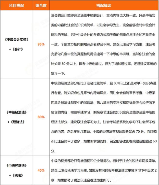 而中級會計職稱考試與注冊會計師考試,在知識點上的重合比例更大,以《中級經(jīng)濟(jì)法》和《經(jīng)濟(jì)法》為例,部分重合內(nèi)容高達(dá)80%;《中級會計實務(wù)》和《會計》這兩部分的知識點契合度甚至高達(dá)95%。