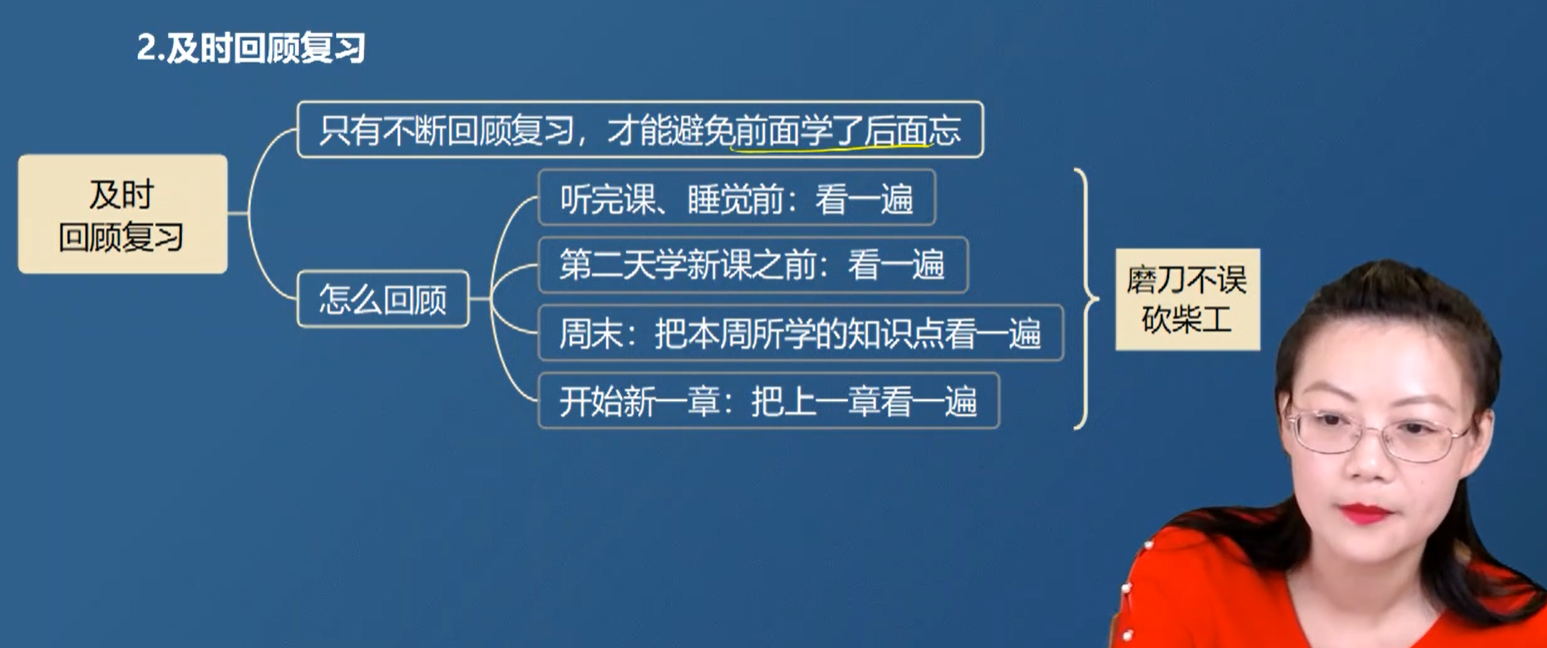 考生若想將知識點(diǎn)內(nèi)容記牢,千萬不能忽視及時復(fù)習(xí)的重要性,只有不斷回顧復(fù)習(xí),才能避免前面學(xué)了后面忘的現(xiàn)象。建議考生學(xué)完新知識后,在睡覺前回顧一遍,第二天學(xué)新知識前再回顧一遍,等到周末有大塊集中的時間進(jìn)行學(xué)習(xí)時,把本周所學(xué)的知識再看一遍,學(xué)完新章節(jié)后把上一章節(jié)的內(nèi)容再看一遍,這樣車輪式復(fù)習(xí)回顧,想要遺忘都很難!