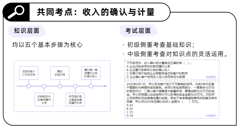 以初級(jí)會(huì)計(jì)職稱(chēng)和中級(jí)會(huì)計(jì)職稱(chēng)中《會(huì)計(jì)》科目中的共同知識(shí)點(diǎn)為例,可以發(fā)現(xiàn),對(duì)于知識(shí)點(diǎn)的考查范圍和深度是有顯著不同的,而也正是因?yàn)閷?duì)知識(shí)點(diǎn)的深入考查,中級(jí)會(huì)計(jì)考試的通過(guò)率基本上在20%左右,有相當(dāng)一部分考生對(duì)知識(shí)的掌握理解程度無(wú)法達(dá)到考試通過(guò)標(biāo)準(zhǔn)。