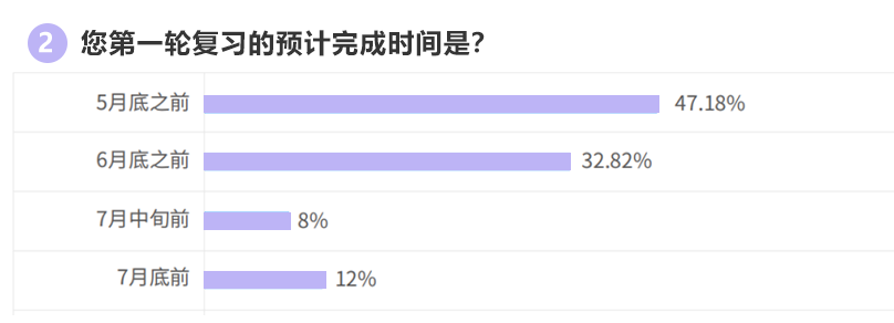 從第一輪復(fù)習(xí)的數(shù)據(jù)來(lái)看,有80%的考生會(huì)在6月底之前完成中級(jí)會(huì)計(jì)第一輪的復(fù)習(xí)計(jì)劃,甚至有近半的考生會(huì)在五月底之前就完成第一輪的復(fù)習(xí)。