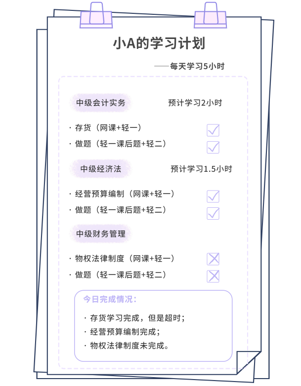 例如:小A計(jì)劃四月份開(kāi)始備考中級(jí),一年過(guò)三科,她的某天的學(xué)習(xí)計(jì)劃如下。
