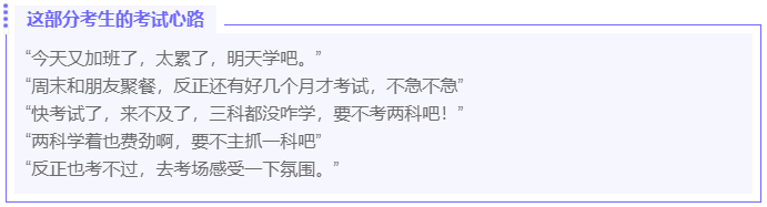 因為備考不充足,這部分考生只能“陪跑”。而他們最大的問題就是,沒有客觀地、系統(tǒng)地中級備考規(guī)劃,備考是盲目地、隨意地且充滿了不確定性。再加之,中級會計備考本身時間周期就長,很多考生沒了計劃的推進更是缺乏耐性,最終導(dǎo)致“幾乎裸考”上考場。