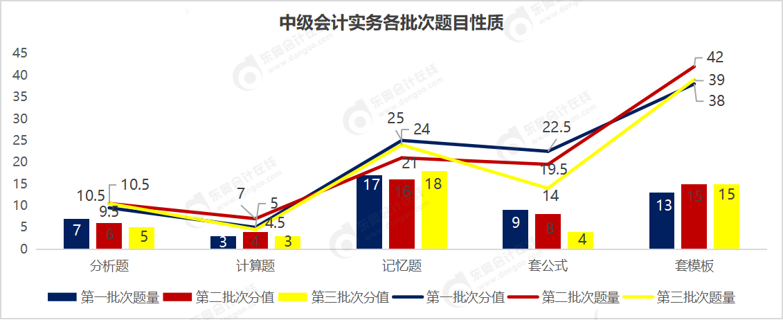 從以上的題目性質(zhì)看,三個(gè)批次題目結(jié)構(gòu)是比較相同的,題量上記憶題題量最大,考查的分?jǐn)?shù)上套模板題目的考查分?jǐn)?shù)最多。計(jì)算題題量和分值占比都是最少的。因此想要在中級(jí)會(huì)計(jì)實(shí)務(wù)考試中取得好成績(jī),對(duì)于基礎(chǔ)知識(shí)點(diǎn)的掌握是非常必要的,同時(shí)要多做類型題來進(jìn)行鞏固。