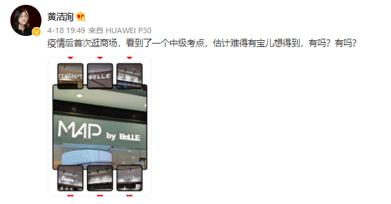一次,黃潔洵老師在疫情平衡后首次逛商場,在女鞋區(qū)發(fā)現(xiàn)了一些店鋪,拍照多個門臉標(biāo)識,發(fā)布微博提問:“看到一個中級考點,估計難得有寶兒想得到,有嗎?有嗎?”