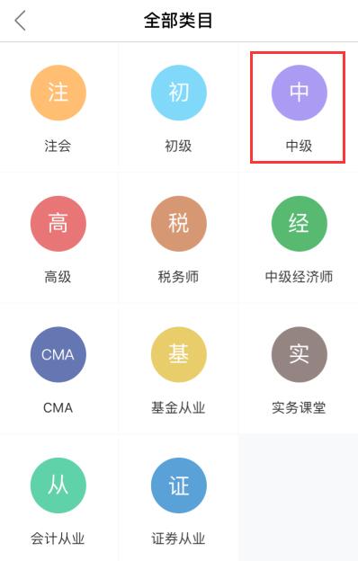 a. 點(diǎn)擊底部左側(cè)【首頁(yè)】按鈕,點(diǎn)擊左上角【選考種】后,在全部類目中選擇【中級(jí)】按鈕。
