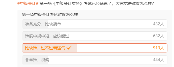 大部分考生都認(rèn)為《中級會計(jì)實(shí)務(wù)》>《財(cái)務(wù)管理》>《經(jīng)濟(jì)法》,今年中級會計(jì)實(shí)務(wù)考試已經(jīng)進(jìn)行了兩個(gè)批次,各個(gè)批次的考試難度如何呢?小編進(jìn)行了投票調(diào)查,不知道屏幕前的各位考生是否認(rèn)同投票結(jié)果呢?
