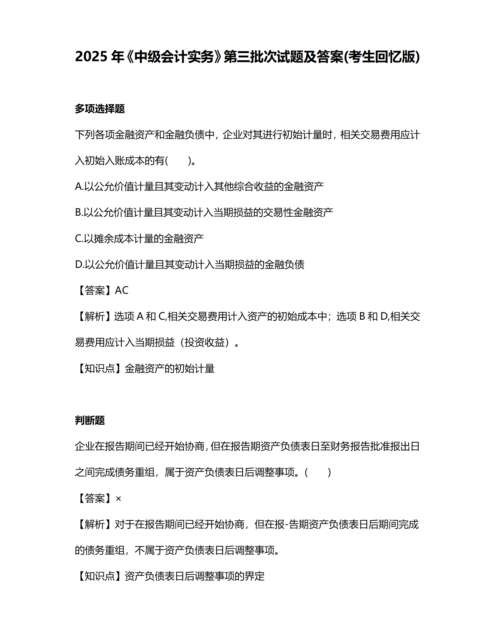 2025年《中級會計實務》考題及參考答案第三批次(考生回憶版)