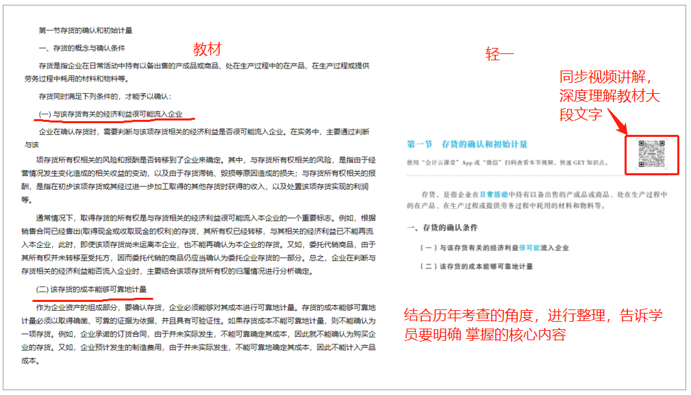 以《中級會計實務(wù)》中的“存貨”章節(jié)為例。東奧會計在線的《輕松過關(guān)?一》輔導(dǎo)書可以從以下幾個方面幫助大家理解教材,高效學(xué)習(xí)。首先,這個章節(jié)需要學(xué)什么、往年考查的情況、最新教材變化等內(nèi)容。然后,提煉考點,將復(fù)雜的專業(yè)術(shù)語用簡單地、便于理解的語言解釋出來,然后結(jié)合歷年考試方向,提煉核心。通過課后的“真題(考生回憶改編版)”熟悉考點的命題方向和出題角度,將知識點放在實戰(zhàn)中演練,做題鞏固。