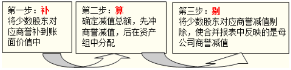 資料給出的子公司的可收回金額通常為整個子公司的可收回金額,該可收回金額既包含母公司購買部分所產(chǎn)生的商譽,也包括了少數(shù)股東的商譽,所以在計算減值金額時,應先推算出少數(shù)股東的商譽,以總的商譽價值加上子公司可辨認凈資產(chǎn)賬面價值作為子公司調(diào)整后的賬面價值,并以此賬面價值和可收回金額比較,進而確認整體的減值損失金額。如下圖所示: