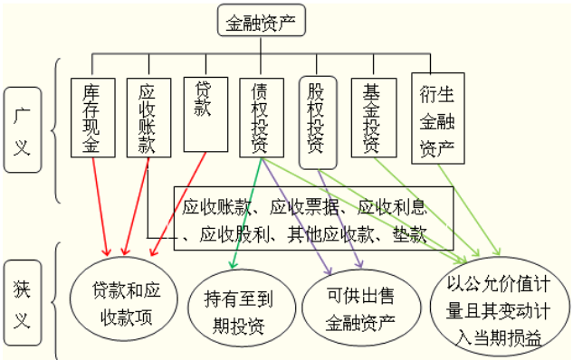 、劢鹑诠ぞ叽_認和計量準則(第22號準則)中所規(guī)范的金融資產(chǎn)是狹義的金融資產(chǎn),即上圖所示的四類金融資產(chǎn),是本章的主要內(nèi)容。廣義金融資產(chǎn)中的部分內(nèi)容,如長期股權(quán)投資,不屬于上述四類金融資產(chǎn)。