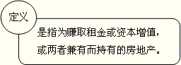 投資性房地產(chǎn)名片:是為賺取租金或資本增值,或者兩者兼有而持有的房地產(chǎn)。