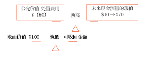 (1)在該現(xiàn)值基礎(chǔ)上,將其與資產(chǎn)公允價(jià)值減去處置費(fèi)用后的凈額相比較,確定其可收回金額