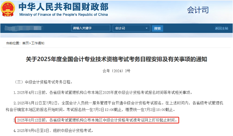 2025年8月12日前,各省級考試管理機(jī)構(gòu)公布本地區(qū)中級會計資格考試準(zhǔn)考證網(wǎng)上打印起止時間。